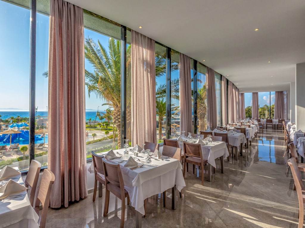 Pääateriat tarjoillaan vilkkaassa pääravintolassa ja ne koostuvat buffeteista, joissa on sekä kreikkalaisia että kansainvälisiä ruokia, joista osa valmistetaan ravintolan show cooking -pisteillä.
