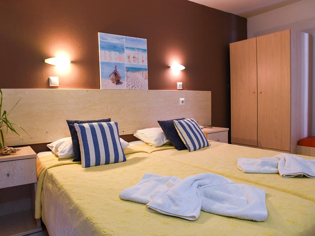 Huoneet ovat hyvin yksinkertaisesti sisustettuja ja kaikissa huoneissa on parveke. Maksuton wifi on käytössä koko hotellialueella ja huoneissa.