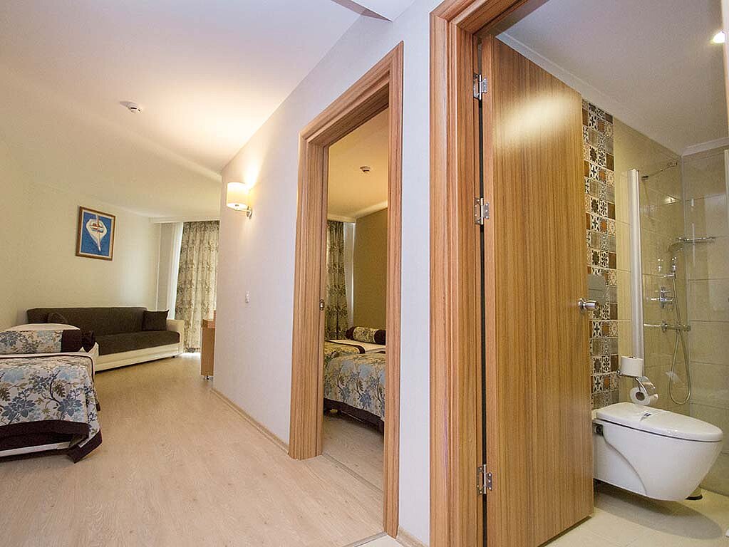 Perhehuone on kooltaan 35 m², ja täällä on kolme kunnollista vuodepaikkaa sekä lisävuode, joka on 190x100 cm kokoinen avattava nojatuoli. Huoneessa tulee olla vähintään kolme täysihintaista majoittujaa, ja tänne mahtuu enintään neljä aikuista. Yhdelle lapselle on mahdollista saada lapsihinta.