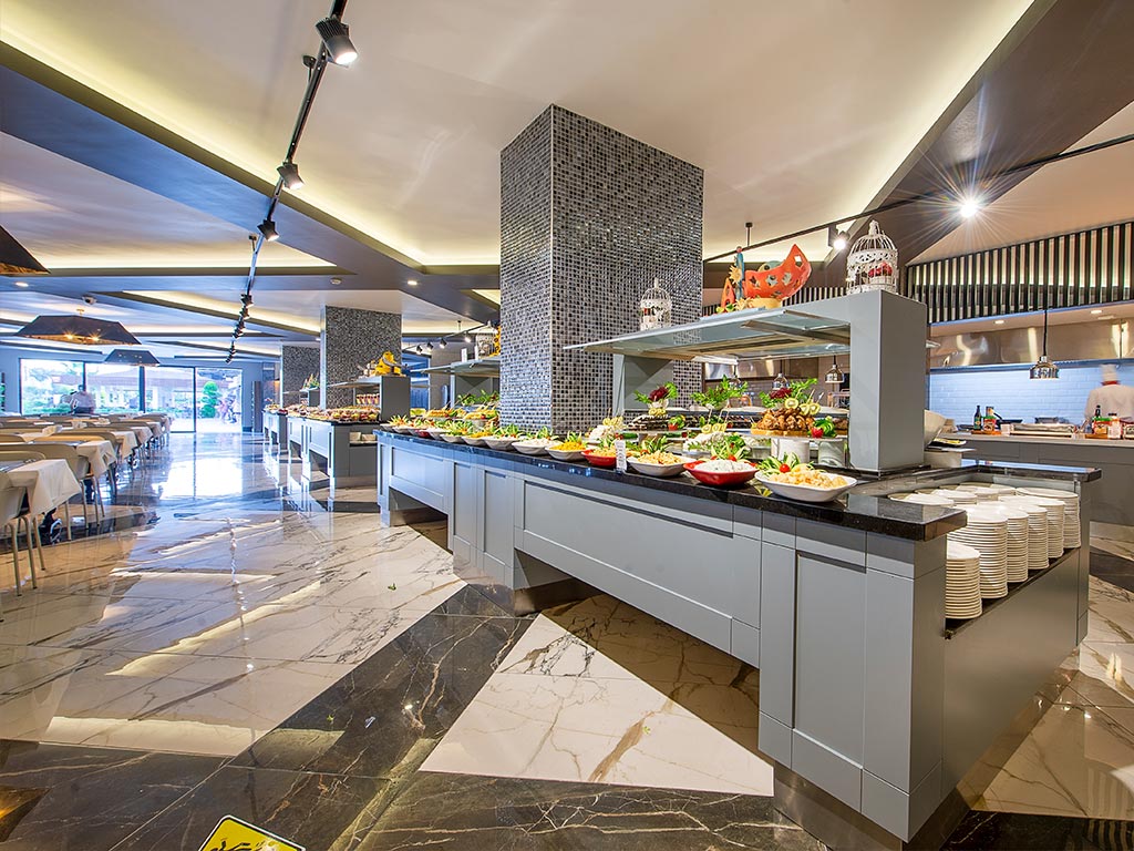 Aamiainen, lounas ja illallinen tarjoillaan buffettina pääravintolassa. Tiettyinä päivinä järjestetään myös juhlavampia teemailtoja illallisen aikaan, mikä tuo lisää tunnelmaa sekä tarjoiluun että ruokalistaan. Kaikki paikalliset juomat sisältyvät hintaan.