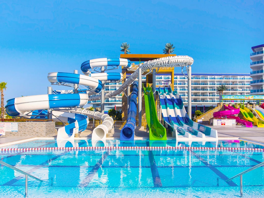 Isot lapset ja leikkisät aikuiset rakastavat beach clubin suurta vesipuistoa, jossa on peräti 12 upeaa vesiliukumäkeä. Pienemmille lapsille on useita erillisiä lastenaltaita, joissa on muun muassa upea merirosvolaiva, pienempiä vesiliukumäkiä ja muita hauskoja vesileikkejä. Yhden lastenaltaan ympäri kulkee pieni lazy river, jossa pienimmät voivat kellua uimarenkailla.