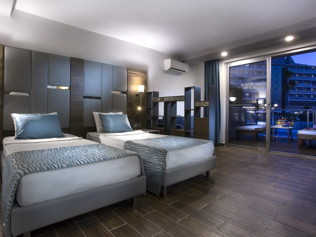 Eftalia Ocean sopii täydellisesti sinulle, joka matkustat lasten kanssa ja haluat majoittua suuren perheesi kanssa tilaviin ja moderneihin huoneisiin. Huoneet on sisustettu valkoisen ja sinisen sävyin, ja inspiraationa on toiminut meri.