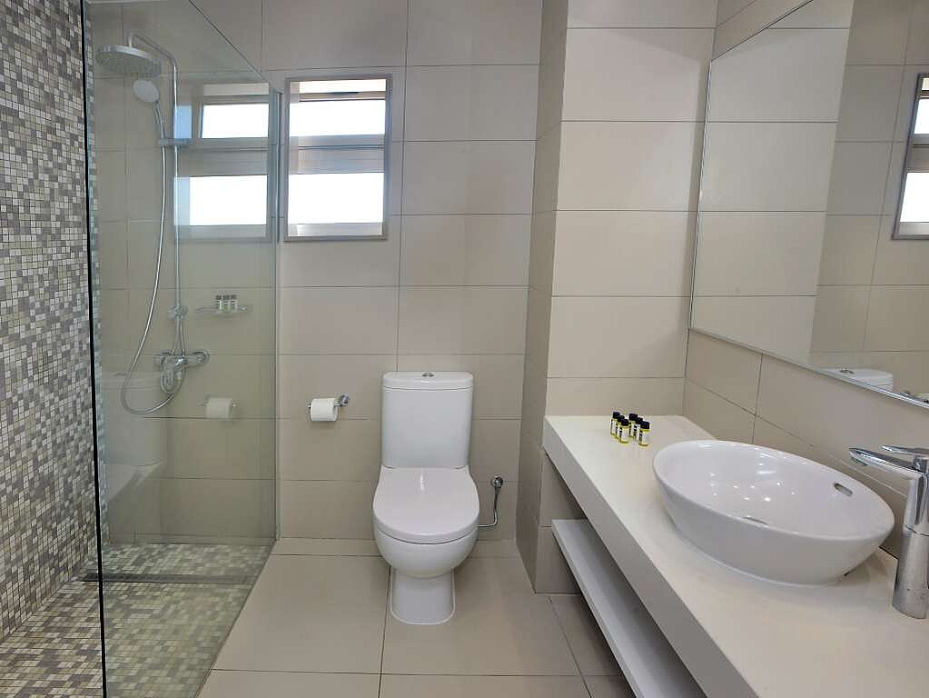 - Suihkukaappi tai suihku ja kylpyamme sekä hiustenkuivaaja