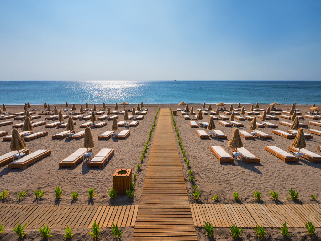 Rantaan on matkaa noin 250 metriä, ja rannan hiekan seassa on pieniä kiviä. Tänne pääsee hotellilta helposti kävelemällä yksityistä tunnelia pitkin, mutta hotellilta pääsee tänne myös golfauton kyydissä, joka kulkee 20 minuutin välein. Rannalla on baari, jossa on tarjolla ruokia ja juomia lisämaksua vastaan.