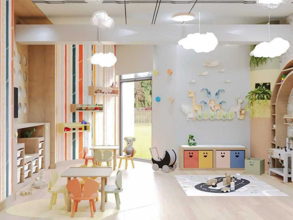 Värikäs lastenklubi leikkipaikalla ja aktiviteeteilla