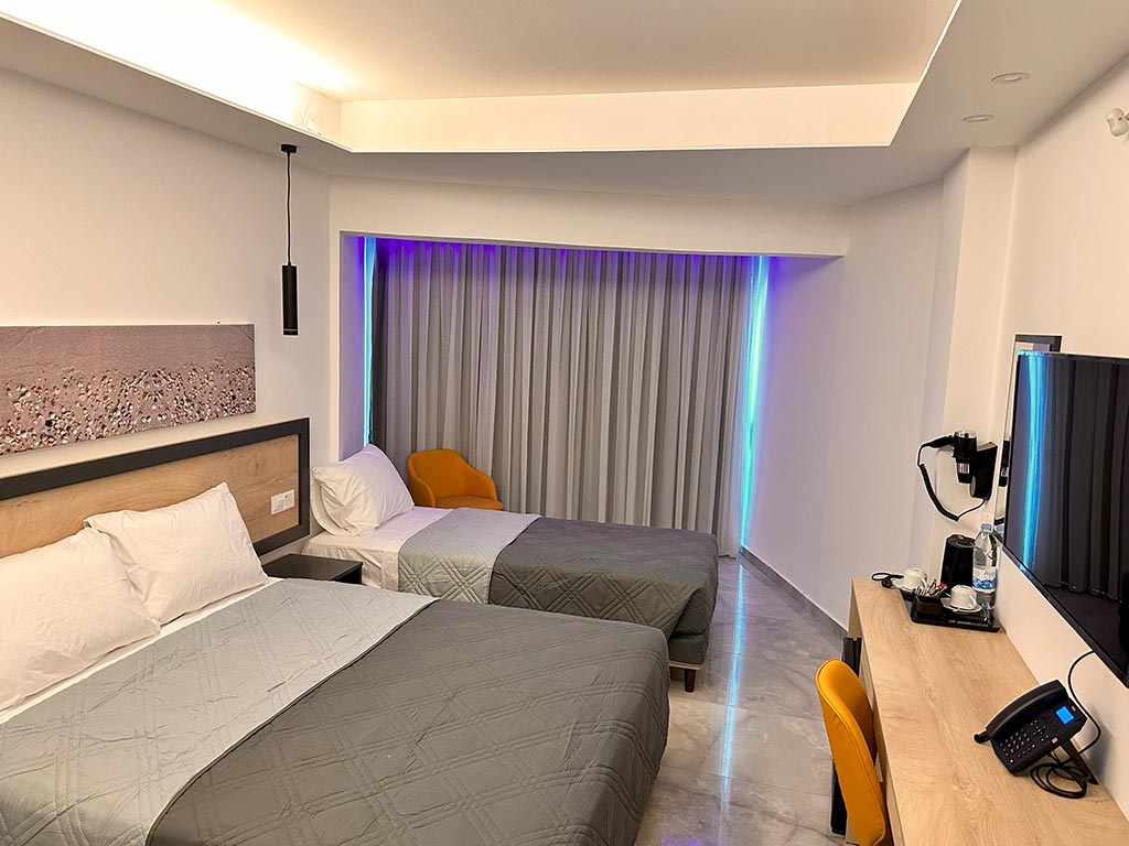 Huoneet Papouis Hotelissa ovat yksinkertaisia, moderneja ja siistejä kylmän sinisissä, harmaissa ja valkoisissa väreissä. Kaikissa huoneissa on laattalattia.