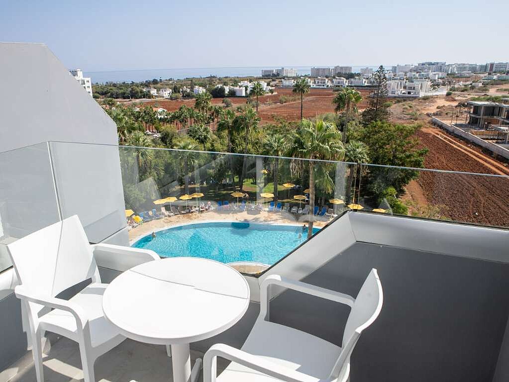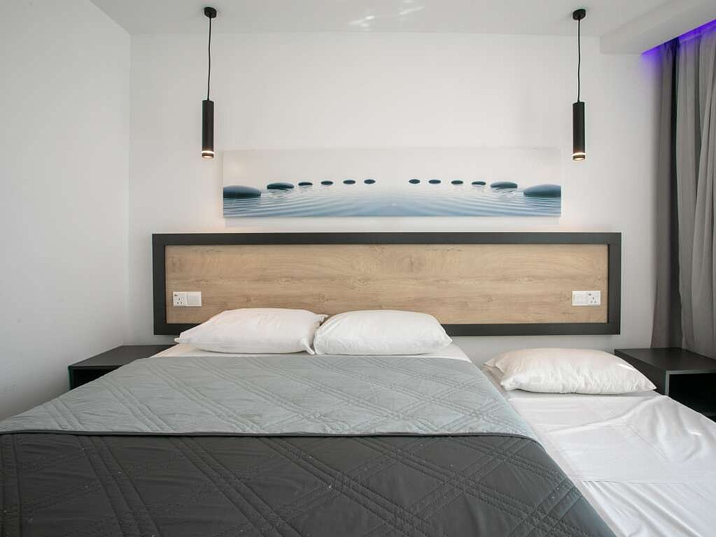 Tässä 20 m² kahden hengen huoneessa allasnäköalalla on kaksi kunnollista vuodepaikkaa ja lisävuode, jonka koko on 80x180 cm. Huoneeseen tarvitaan vähintään kaksi täysihintaista, ja enintään kolme aikuista voi majoittua täällä. Yhdelle lapselle on mahdollista saada lapsihinta. Huoneen voi myös varata yhden hengen huoneena lisämaksusta.