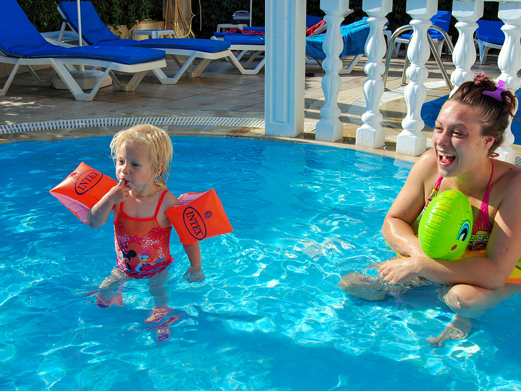 Pienellä ja viihtyisällä allasalueella vallitsee ihana lomatunnelma. Alueella on sekä uima-allas että erillinen lastenallas, jossa on vesiliukumäki perheen pienimmille. Altaiden ympärillä on aurinkotuoleja ja aurinkovarjoja vapaasti käytettävissä. Allasbaari on avoinna koko päivän ja tarjoaa erilaisia maukkaita juomia ja drinkkejä lisämaksusta.