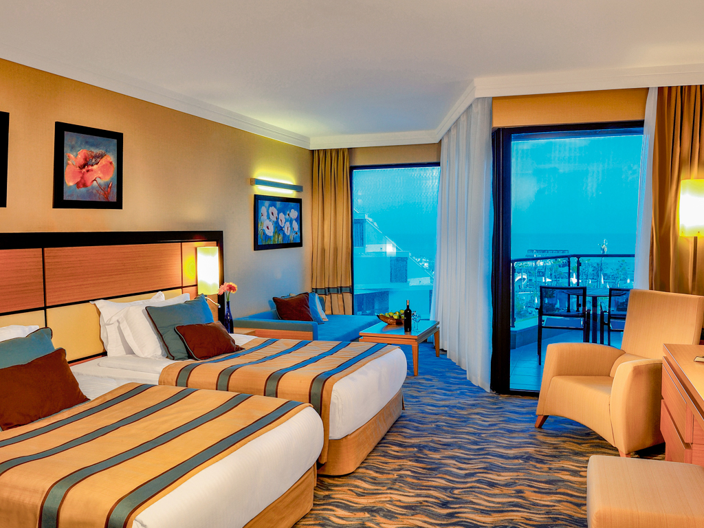 Kummassakin huoneessa on laminaattilattia, kylpyhuone, puhelin, minibaari, vedenkeitin kahvi- ja teetarpeilla, parveke ja tv. Tilaa on runsaasti noin tässä 76 neliössä ja täällä saat osittaisen merinäköalan, joka siis kuuluu hintaan. Huoneessa tulee olla vähintään kaksi täysihintaista ja täällä voi enimmillään asua neljä aikuista. Mahdollisuus saada kaksi lapsihintaa.