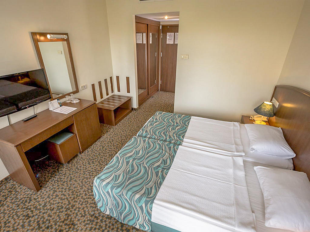 Kaikista hotellin kodikkaista huoneista löytyy päivittäin vesipullolla täytetty minijääkaappi, vedenkeitin, tee- ja kahvintekovälineet, wifi, hiustenkuivaaja, kylpyamme tai suihkukaappi, keskusilmastointi, tv, parveke, sekä tallelokero, joka on lisämaksua vastaan. Huoneen näköala avautuu joko altaan tai hotellin ympäristön suuntaan.