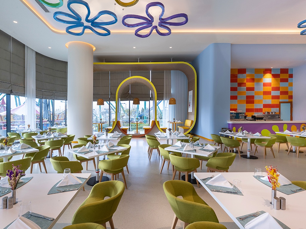 Ateriat tarjoillaan hotellin pääravintolassa, jossa painopiste on lapsiperheille. Tunnelma on leikkisä ja rento, ja tarjolla on runsaasti vaihtoehtoja sekä pienille että suurille – täydellistä, kun energian tulisi riittää aamusta iltaelämyksiin asti.