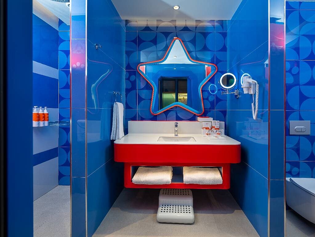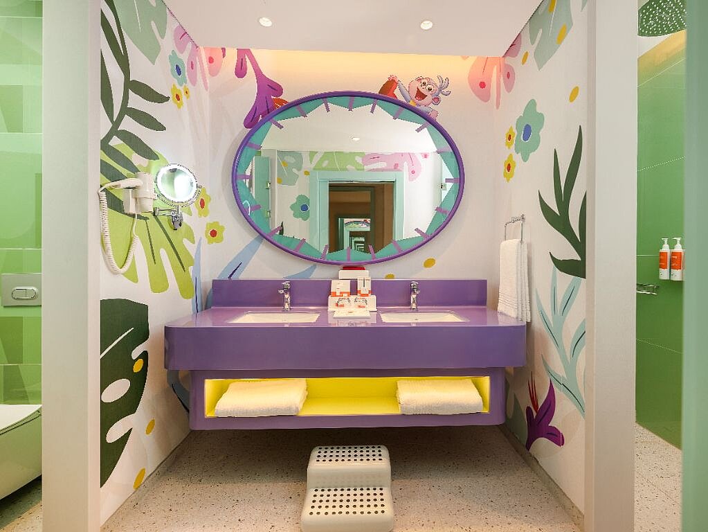 Nämä huoneet on suunniteltu toimimaan perheen arjessa lomalla: tilavat neliöt ja fiksut ratkaisut helpottavat yhdessä asumista. Kylpyhuoneissa on lapsiystävällisiä yksityiskohtia, kuten jakkara, jotta pienimmätkin voivat toimia omatoimisemmin, kun on aika pestä kädet, harjata hampaat tai valmistautua seuraavaan seikkailuun.